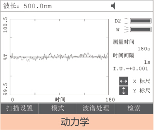 3、動力學測量:固定波長(cháng)下(xià)測量樣品在設定時(shí)間(jiān)內(nèi)的(de)變化(huà),自(zì)動繪制(zhì)圖譜并可(kě)自(zì)定義坐(z×uò)标,可(kě)計(jì)算(suàn)樣品的(de)反應率?A/t。