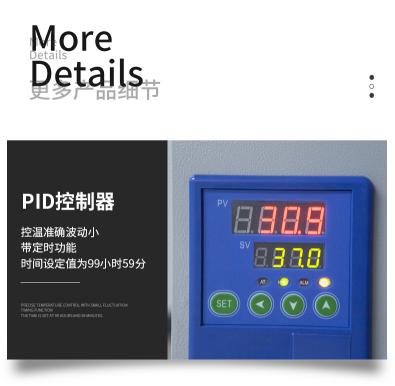 ● 模糊PID控制(zhì)器(qì),控溫精确波動小(xiǎo),帶定時(shí)功能(néng),時(shí)間(jiān)較大(dà)設定值為(wèi)99小(xiǎo)時(shí)59分α(fēn)。