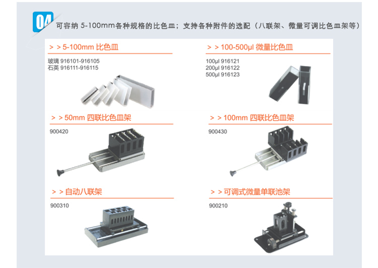2、 寬大(dà)的(de)樣品室,可(kě)容納 5-100mm各種規格的(de)比色皿;支持各種附件(ji€àn)的(de)選配(八聯架、微(wēi)量可(kě)調比色皿架等),大(dà)大(dà)提高(gāo)測試效率