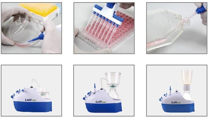 Lafil100 極小(xiǎo)的(de)體(tǐ)積設計(jì)并內(nèi)裝真空(kōng)泵,可(kě)直接放(•fàng)到(dào)無菌操作(zuò)台內(nèi)操作(zuò)使用(yòng)
