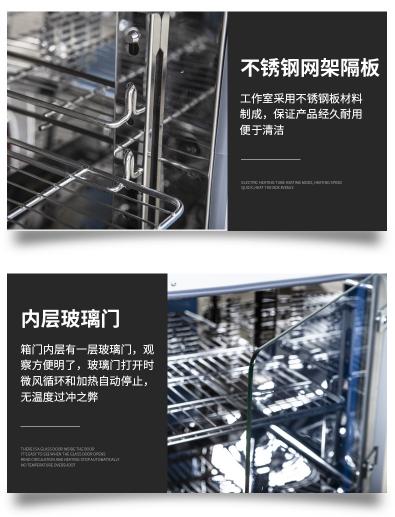● 箱門(mén)內(nèi)層有(yǒu)一(yī)層玻璃門(mén),觀察方便明(míng)了(le),玻璃門(mén)打開(kāi)時(shí),微(w'ēi)風(fēng)循環和(hé)加熱(rè)自(zì)動停止,無溫度過沖之弊。